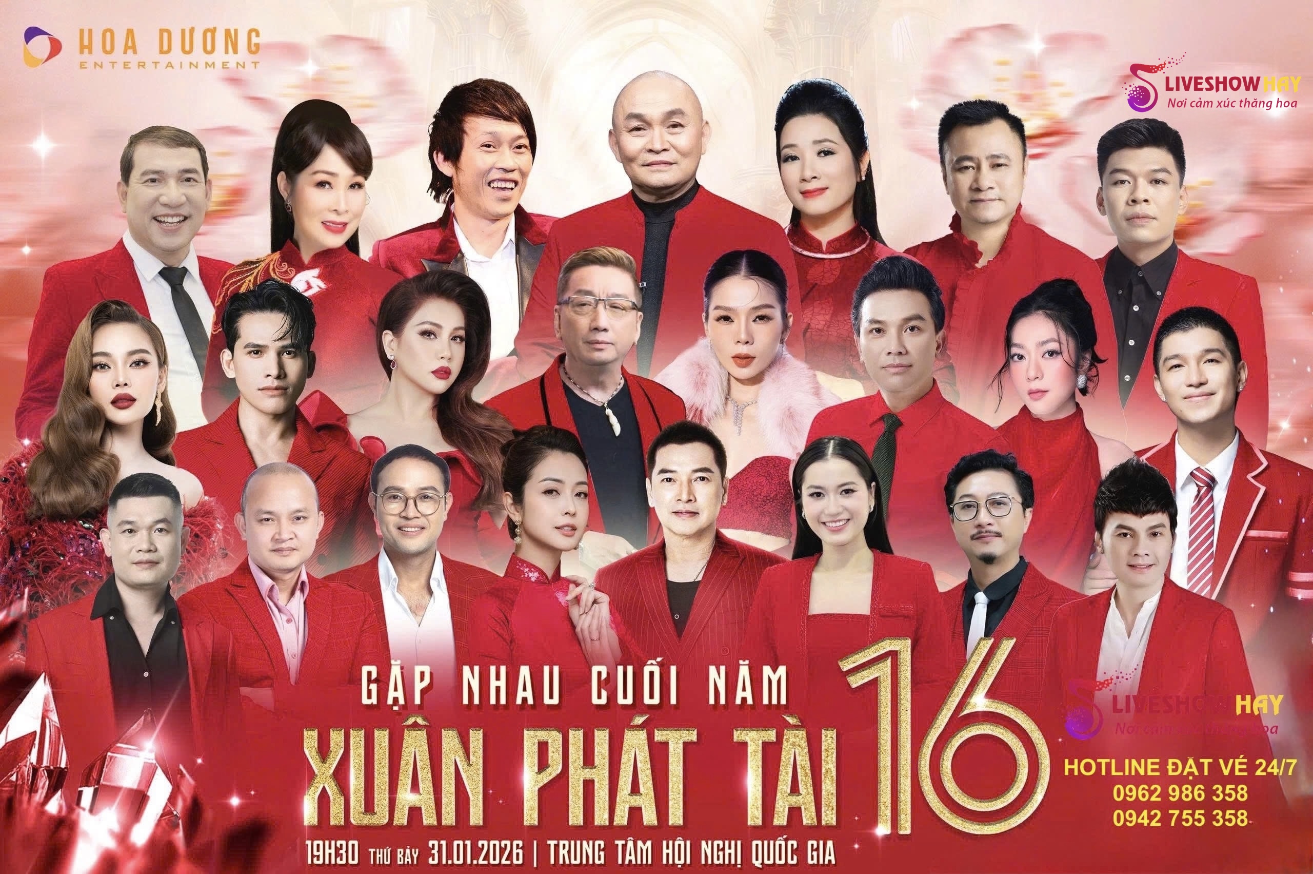 Liveshow Đêm Nhạc Xuân Phát Tài 16 diễn ra vào 19h30, Thứ 7 ngày 31/1/2026 tại Trung tâm Hội nghị Quốc gia, cổng số 1 Đại lộ Thăng Long, Hà Nội. Gọi mua vé: 0962 986 358 / 0942 755 358.